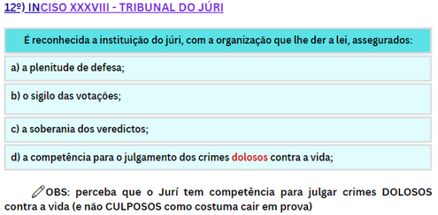 ATENÇÃO! O Júri só tem competência para julgar crimes DOLOSOS contra a vida (e não CULPOSOS como costuma cair em prova). Bora ficar de olho.