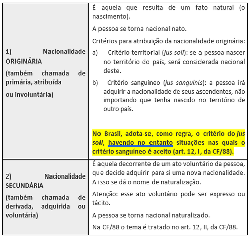 No Brasil, adota-se, como regra, o critério do jus soli, havendo no entanto situações nas quais o critério sanguíneo é aceito (art. 12, I, da CF/88).No Brasil, adota-se, como regra, o critério do jus soli, havendo no entanto situações nas quais o critério sanguíneo é aceito (art. 12, I, da CF/88).
