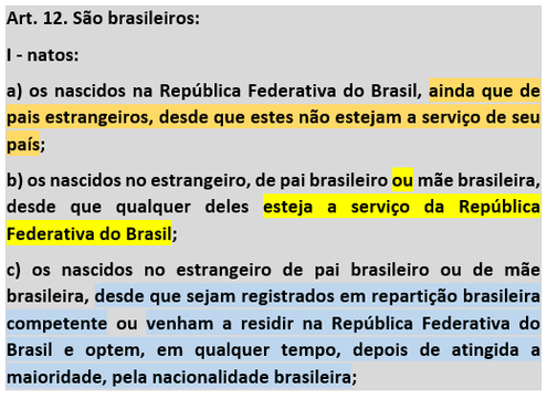 “O que significa “estar a serviço do Brasil”? Significa estar a serviço do Estado brasileiro, numa missão diplomática, ou a serviço da Administração Pública direta ou indireta, federal, estadual ou municipal. Nesse sentido, Valério Mazzuoli afirma que “o serviço a que se refere o texto constitucional deve ser entendido em sentido largo, compreendendo qualquer encargo derivado dos poderes da União, dos Estados e dos Municípios, bem como as autarquias. Amplia-se também o conceito aos serviços que o Brasil participa nas Organizações Internacionais das quais é parte”.