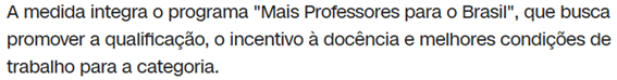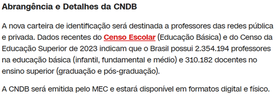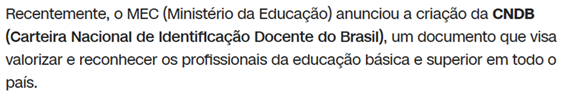 SE13955 - (Siga Escrevente. 2025. Inéditas) O Ministério da Educação (MEC) anunciou a criação da Carteira Nacional de Identificação Docente do Brasil (CNDB), um documento com o objetivo de valorizar e reconhecer os professores em todo o país. A medida integra um programa mais amplo do governo federal.