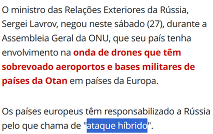 SE13949 - (Siga Escrevente. 2025. Inéditas) O ministro das Relações Exteriores da Rússia, Sergei Lavrov, negou o envolvimento de seu país em uma onda de drones que sobrevoam aeroportos e bases militares europeias. Os países europeus têm responsabilizado a Rússia por essa ação.