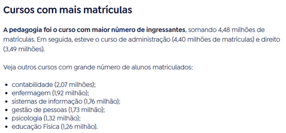 SE13950 - (Siga Escrevente. 2025. Inéditas) O Censo da Educação Superior 2024 revelou dados sobre as preferências dos estudantes brasileiros. O levantamento mostrou que, entre os cursos de graduação, um deles se destacou com o maior número de matrículas, totalizando 4,48 milhões.