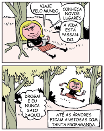No comentário “Até as árvores ficam ansiosas com tanta propaganda”, foram empregadas duas figuras de linguagem, fundamentais para a construção do efeito de humor da tirinha. São elas: