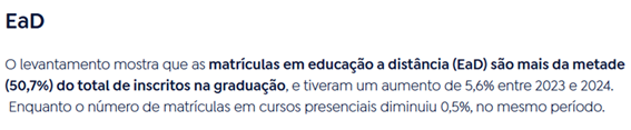 SE13952 - (Siga Escrevente. 2025. Inéditas) O Censo da Educação Superior 2024, realizado pelo Inep, apontou que o Brasil atingiu a marca de mais de 10 milhões de estudantes no ensino superior. O levantamento também destacou o crescimento de uma modalidade de ensino em detrimento de outra.