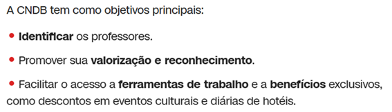 SE13954 - (Siga Escrevente. 2025. Inéditas) A Carteira Nacional de Identificação Docente do Brasil (CNDB) é uma iniciativa do Ministério da Educação (MEC) que busca melhorar as condições de trabalho e o reconhecimento da categoria.