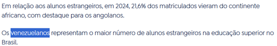 SE13951 - (Siga Escrevente. 2025. Inéditas) O Censo da Educação Superior 2024 também analisou a origem dos alunos estrangeiros matriculados no Brasil. O levantamento mostrou que, em 2024, 21,6% dos alunos vieram do continente africano, com destaque para os angolanos.