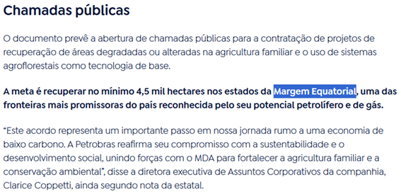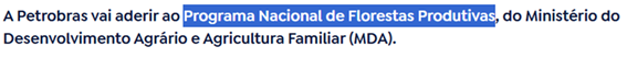 SE13862 - (Siga Escrevente. 2025. Inéditas) A Petrobras anunciou sua adesão a uma iniciativa do Ministério do Desenvolvimento Agrário e Agricultura Familiar (MDA), que é considerada prioridade do governo federal na COP 30. O projeto visa à recuperação de áreas degradadas, à integração entre lavoura, pecuária e floresta, e ao incentivo de cultivos rentáveis, como cacau e açaí, para garantir renda à agricultura familiar.