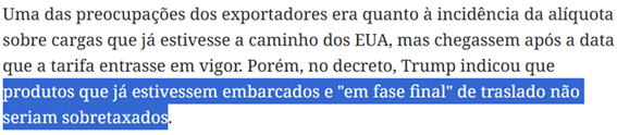 SE13867 - (Siga Escrevente. 2025. Inéditas) A tarifa de importação de 50% aplicada pelos Estados Unidos sobre produtos brasileiros entrou em vigor, o que representa uma pressão comercial sobre o Brasil. No decreto, o presidente Donald Trump indicou que alguns produtos não seriam sobretaxados, minimizando o impacto imediato sobre os exportadores.