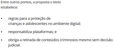 SE13868 - (Siga Escrevente. 2025. Inéditas) A Câmara dos Deputados aprovou em regime de urgência um projeto de lei que visa o combate à adultização de crianças e adolescentes nas redes sociais. A proposta, que gerou debate, lista uma série de medidas essenciais para o ambiente digital.