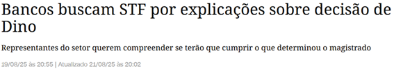 SE13863 - (Siga Escrevente. 2025. Inéditas) A decisão que gerou tensão no sistema financeiro e motivou grandes bancos a procurarem ministros do STF com uma visão mais pragmática refere-se à validade de normas estrangeiras no Brasil. A decisão determina que tais normas precisam ser homologadas pela Corte para terem efeito no país.