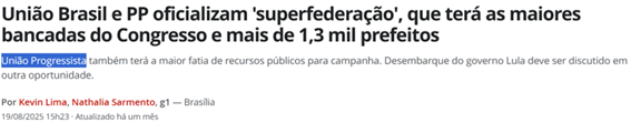 SE13861 - (Siga Escrevente. 2025. Inéditas) União Brasil e Progressistas (PP) oficializaram a criação de uma federação partidária, que se tornará a maior força política do país em número de deputados e recursos. O passo final para a formalização da aliança foi dado nesta terça-feira (19) com a aprovação do estatuto da federação.