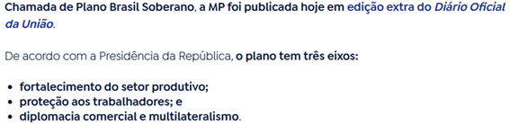 De acordo com a notícia, quais são os três eixos principais de atuação do Plano Brasil Soberano?