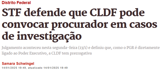 SE12934 - (Siga Escrevente. 2025. Inéditas) O Supremo Tribunal Federal (STF) concluiu o julgamento da Ação Direta de Inconstitucionalidade (ADI) 6725, em que se discutia a constitucionalidade de um dispositivo da Lei Orgânica do Distrito Federal relacionado à atuação do procurador-geral do DF.