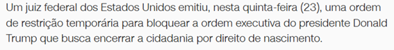SE12935 - (Siga Escrevente. 2025. Inéditas) O presidente dos Estados Unidos, Donald Trump, assinou uma ordem executiva visando encerrar a concessão automática de cidadania a crianças nascidas no país, conhecidas como "jus soli".
