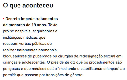 SE12912 - (Siga Escrevente. 2025. Inéditas) Em 28 de janeiro de 2025, o presidente dos Estados Unidos, Donald Trump, assinou uma ordem executiva que proíbe o financiamento federal para tratamentos médicos de transição de gênero em menores de 19 anos.