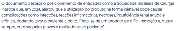 SE12913 - (Siga Escrevente. 2025. Inéditas) O Conselho Federal de Medicina (CFM) recomendou à Agência Nacional de Vigilância Sanitária (Anvisa) a proibição do uso do polimetilmetacrilato (PMMA) como substância de preenchimento estético, devido aos riscos associados.