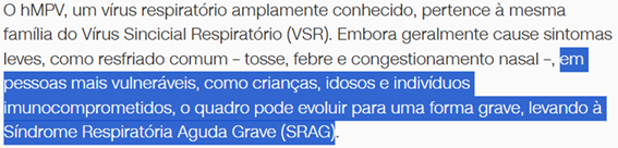 SE12914 - (Siga Escrevente. 2025. Inéditas) O Metapneumovírus Humano (hMPV) é um vírus respiratório que pode causar desde sintomas leves até quadros graves. Sobre esse agente infeccioso, assinale a alternativa correta: