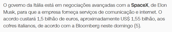 SE12919 - (Siga Escrevente. 2025. Inéditas) O governo italiano está em negociações com a SpaceX, empresa do bilionário Elon Musk, para firmar um contrato bilionário com o objetivo de obter serviços estratégicos. O acordo, com duração prevista de cinco anos, foi previamente aprovado pelos serviços de inteligência e pelo Ministério da Defesa da Itália.