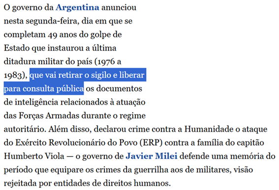 SE12915 - (Siga Escrevente. 2025. Inéditas) No Dia Nacional da Memória, o governo argentino anunciou a retirada do sigilo de documentos da ditadura militar (1976–1983) e a transferência desses arquivos para o Arquivo Geral da Nação.