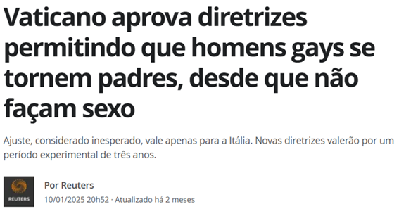 SE12921 - (Siga Escrevente. 2025. Inéditas) O Vaticano publicou novas diretrizes sobre o ingresso de candidatos ao sacerdócio, promovendo ajustes considerados inesperados dentro da estrutura da Igreja Católica. A medida inicialmente se aplica à Itália e foi divulgada discretamente pela conferência dos bispos italianos.