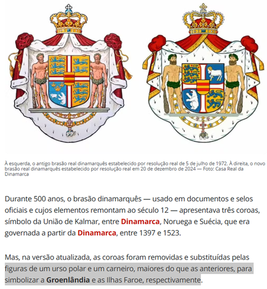 SE12911 - (Siga Escrevente. 2025. Inéditas) O rei Frederico 10º promoveu uma mudança significativa no brasão da Casa Real Dinamarquesa, que gerou repercussão internacional e críticas de alguns setores acadêmicos. A alteração ocorreu em um contexto político sensível, envolvendo os territórios autônomos sob soberania da Dinamarca.