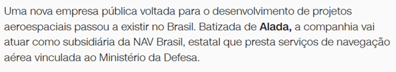 SE12910 - (Siga Escrevente. 2025. Inéditas) Uma nova empresa pública voltada para o desenvolvimento de projetos aeroespaciais passou a existir no Brasil. Batizada de _________, a companhia vai atuar como subsidiária da NAV Brasil, estatal que presta serviços de navegação aérea vinculada ao Ministério da Defesa.