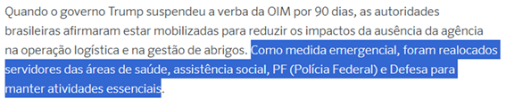 SE12906 - (Siga Escrevente. 2025. Inéditas) O presidente dos Estados Unidos, Donald Trump, suspendeu por 90 dias os repasses de recursos destinados a projetos de ajuda humanitária, afetando diretamente a Operação Acolhida no Brasil. Diante desse cenário, o governo brasileiro adotou medidas emergenciais para manter o funcionamento da operação.