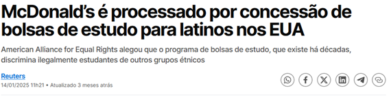 SE12904 - (Siga Escrevente. 2025. Inéditas) Um grupo contrário à política de ação afirmativa entrou com uma ação judicial contra o McDonald’s nos Estados Unidos, em razão da manutenção de um programa específico de concessão de bolsas de estudo.