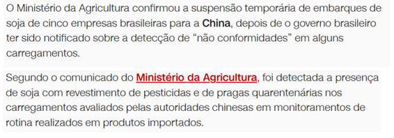 SE12907 - (Siga Escrevente. 2025. Inéditas) A China suspendeu temporariamente as importações de soja de cinco empresas brasileiras devido à detecção de não conformidades nos carregamentos.