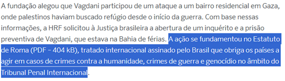 SE12909 - (Siga Escrevente. 2025. Inéditas) A atuação da Fundação Hind Rajab (HRF) teve repercussão internacional ao provocar a abertura de uma investigação no Brasil contra um reservista israelense que esteve em território brasileiro. A medida judicial brasileira atendeu a um pedido protocolado pela HRF, que alegou envolvimento do suspeito em ações militares na Faixa de Gaza.