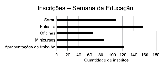 SE3491 - (6ª Rodada Semanal Objetiva. 2020. Vunesp) Uma faculdade realizará a Semana da Educação. Veja no gráfico as inscrições que foram realizadas para cada modalidade oferecida na Semana da Educação.