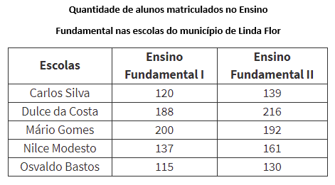 SE3492 - (6ª Rodada Semanal Objetiva. 2020. Vunesp) No município de Linda Flor há cinco escolas de Ensino Fundamental. Veja na tabela a seguir a quantidade de alunos matriculados em cada etapa do Ensino Fundamental nessas escolas.