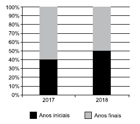 SE3494 - – (6ª Rodada Semanal Objetiva. 2020. Vunesp) O gráfico apresenta a distribuição do número total de matrículas efetuadas em 2017 e 2018 em uma escola de Ensino Fundamental, nas variáveis anos iniciais e anos finais.