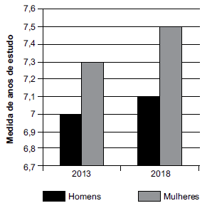 SE3490 - (6ª Rodada Semanal Objetiva. 2021. Vunesp) Em certo município, uma pesquisa é realizada a cada 5 anos. Dentre várias perguntas da pesquisa, uma tem o objetivo de identificar o número médio de anos de estudos dos munícipes. O gráfico a seguir apresenta informações sobre esse número, das duas últimas edições da pesquisa.