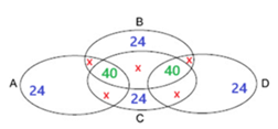 Nesse diagrama lógico, cada região que possui elementos de apenas 1 conjunto possui 24 elementos, e em cada região que se caracteriza por ser intersecção de 3 e apenas 3 conjuntos possui 40 elementos. Sabe-se que, no total, são 416 elementos que fazem parte desse diagrama e que o número de elementos que pertencem a cada região, que se caracteriza por ser intersecção de 2 e apenas 2 conjuntos, é igual entre si. E esse número é