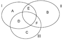 SE12847 - (Escrevente Técnico do Judiciário - TJ/SP. 2023. Vunesp) Três conjuntos: I, II e III formam um diagrama lógico com a seguinte disposição: As regiões A, D e E são regiões do conjunto I.