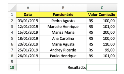 SE2463 - (Administrador de Edifícios. 2019. AOCP) No seguinte exemplo, foi criada uma planilha utilizando o Microsoft Office Excel 2016 com idioma Português do Brasil para controle de comissão de funcionários.