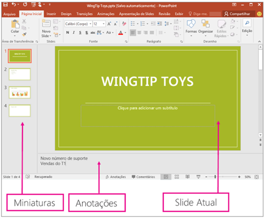 SE12658 - (Contador – Pref Taubaté. 2024. Vunesp) Um usuário está criando uma apresentação no Microsoft PowerPoint 2016, em sua configuração padrão, conforme imagem a seguir.