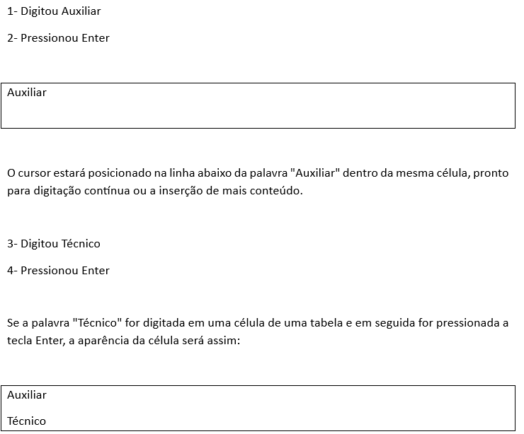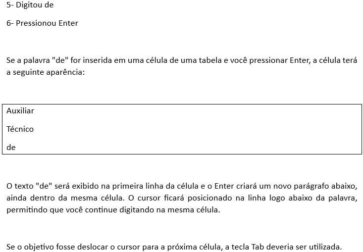 SE12556 - (Auxiliar Técnico de Educação. 2024. Vunesp) Em um documento vazio do MS-Word 365, em sua configuração padrão, um usuário inseriu uma tabela com 1 linha e uma coluna. Com o cursor dentro da única célula inicial, executou as operações descritas a seguir, na ordem em que aparecem: