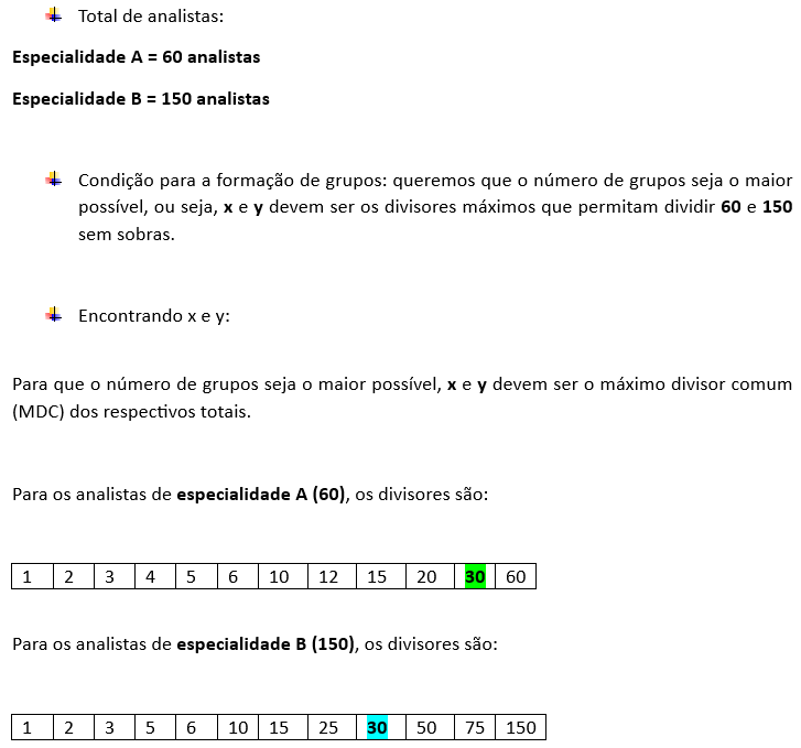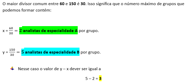 SE12548 - (Analista Legislativo/Pedagogo. 2024. Vunesp) Um grupo com 60 novos analistas legislativos com especialidade A e 150 novos analistas legislativos com especialidade B precisa ser dividido em grupos menores, contendo, cada um, x analistas com especialidade A e y analistas com especialidade B. Para tanto, não pode haver analista fora de um grupo, e o número de grupos tem que ser o maior possível. Nesse caso o valor de y – x dever ser igual a