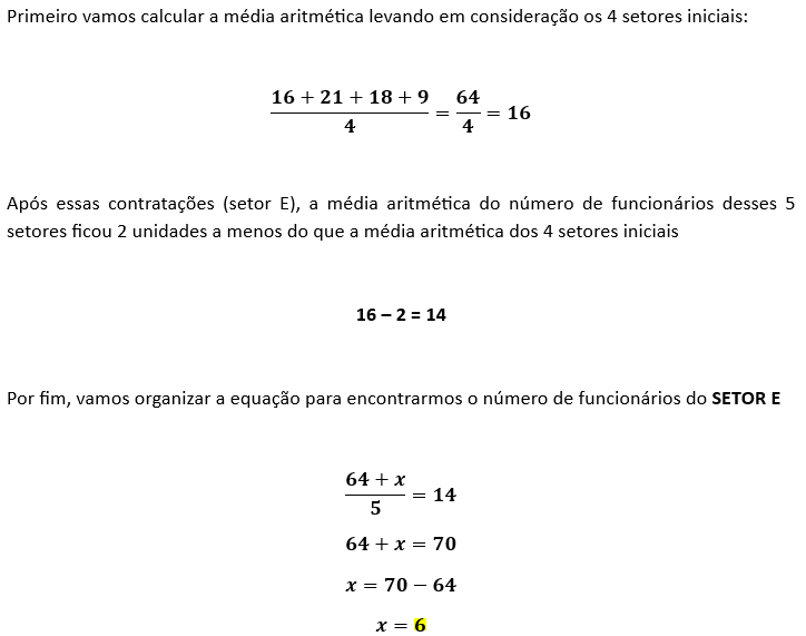Essa empresa criou um novo setor E, para o qual foram contratados determinado número de novos funcionários. Após essas contratações, a média aritmética do número de funcionários desses 5 setores ficou 2 unidades a menos do que a média aritmética dos 4 setores iniciais. O número de novos funcionários contratados para o setor E foi