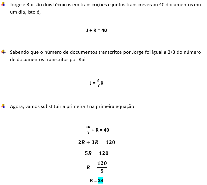 SE12552 - (Técnico Legislativo. 2024. Vunesp) Jorge e Rui são dois técnicos em transcrições e juntos transcreveram 40 documentos em um dia. Sabendo que o número de documentos transcritos por Jorge foi igual a 2/3 do número de documentos transcritos por Rui, então, o número de documentos que Rui transcreveu a mais do que Jorge foi