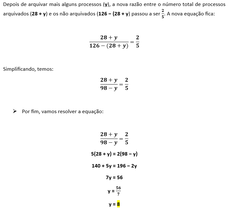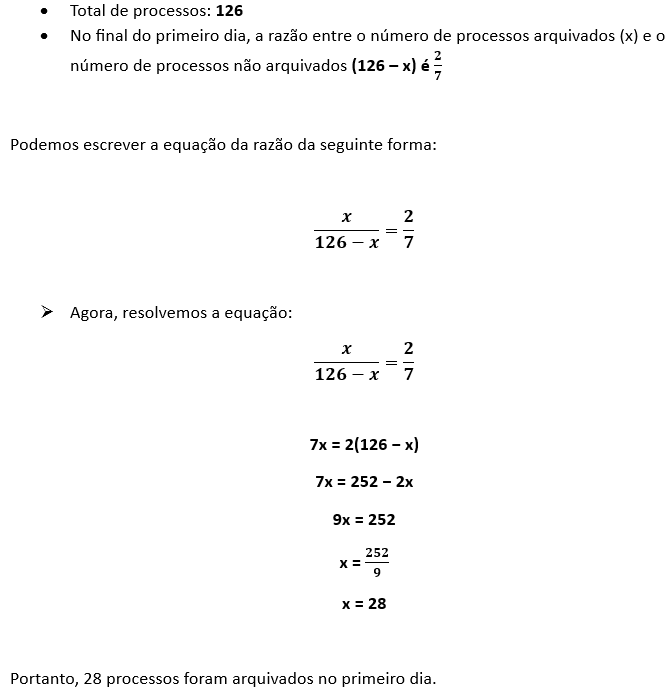 SE12547 - (Técnico de Transcrição. 2024. Vunesp) Em um escritório, há 126 processos para serem arquivados. Após o primeiro dia de trabalho, a razão do número de processos arquivados para o número de processos não arquivados era 2/7. Na manhã do segundo dia de trabalho, mais alguns processos foram arquivados, de modo que a razão citada passou a ser 2/5. O número de processos arquivados na manhã do segundo dia de trabalho foi