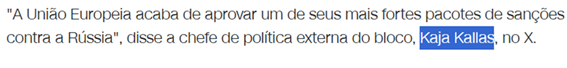 SE13809 - (Siga Escrevente. 2025. Inéditas) A União Europeia aprovou um 18º pacote de sanções contra a Rússia, visando a enfraquecer o seu setor de petróleo e gás. Após a aprovação das medidas, uma alta autoridade do bloco se manifestou, classificando o novo pacote como um dos mais fortes já aprovados contra Moscou.