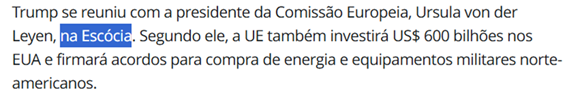 SE13818 - (Siga Escrevente. 2025. Inéditas) Para selar o novo acordo comercial entre os Estados Unidos e a União Europeia, o presidente americano, Donald Trump, se encontrou com a presidente da Comissão Europeia, Ursula von der Leyen, em um país europeu.