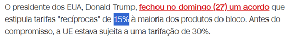 De acordo com a notícia, qual é a porcentagem da tarifa "recíproca" estipulada no acordo para a maioria dos produtos da União Europeia?