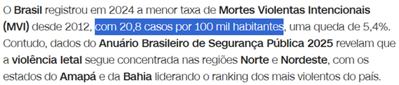 SE13813 - (Siga Escrevente. 2025. Inéditas) Dados do Anuário Brasileiro de Segurança Pública 2025 revelaram que o Brasil atingiu a menor taxa de Mortes Violentas Intencionais (MVI) desde 2012, com uma redução de 5,4% em relação ao ano anterior.