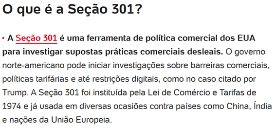 SE13812 - (Siga Escrevente. 2025. Inéditas) O presidente dos Estados Unidos, Donald Trump, anunciou tarifas de importação de 50% sobre produtos brasileiros, justificando a medida por meio de um dispositivo legal chamado “Seção 301”. O texto explica que esta é uma importante ferramenta de política comercial dos EUA.