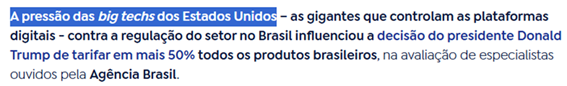 SE13811 - (Siga Escrevente. 2025. Inéditas) A decisão do governo dos Estados Unidos de impor uma tarifa de 50% sobre os produtos brasileiros é vista como um ato de sanção econômica com objetivos políticos. A medida foi justificada por um motivo específico, embora, na avaliação de especialistas, a verdadeira razão seja outra.