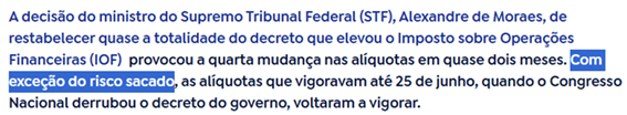 SE13800 - (Siga Escrevente. 2025. Inéditas) A decisão do ministro do STF, Alexandre de Moraes, de restabelecer o decreto do IOF (Imposto sobre Operações Financeiras) resultou em um novo cenário econômico para empresas e cidadãos. A medida, que já é a quarta mudança em menos de dois meses, reflete o embate entre os Poderes.